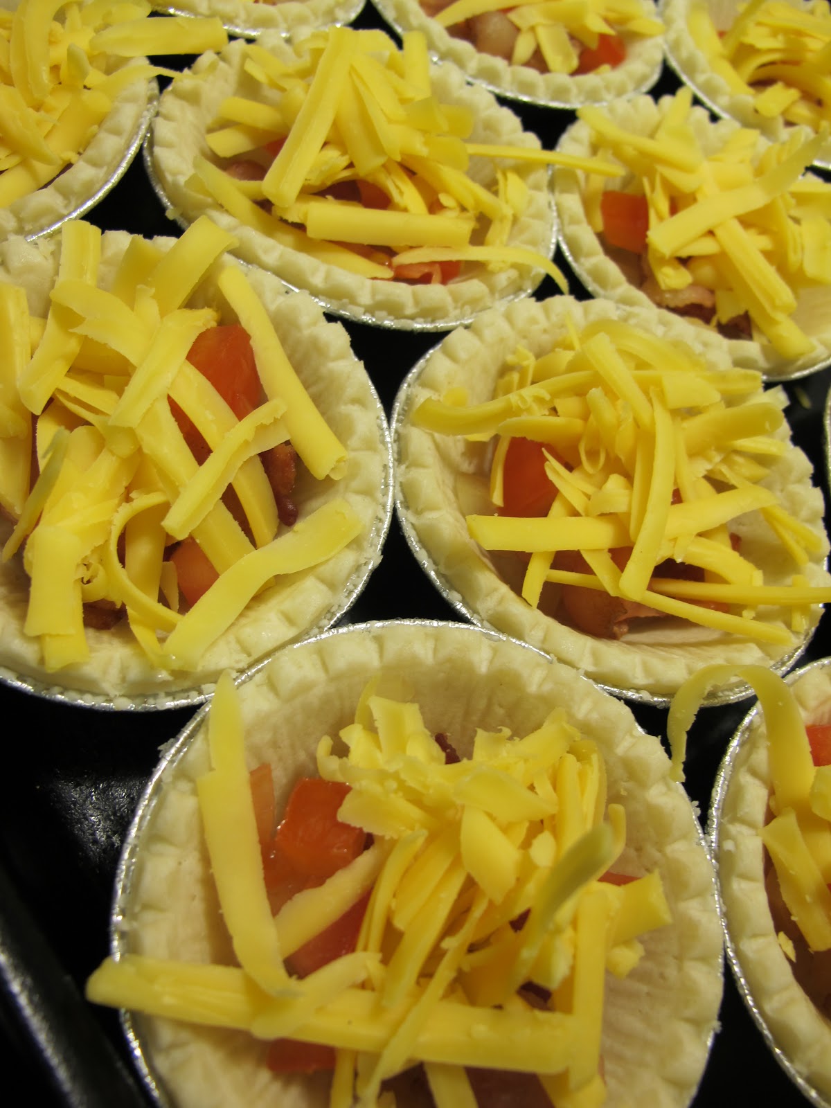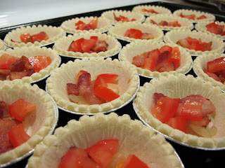 Place frozen tartlet shells on a baking sheet and fill with prepared ingredients (onion, tomato, bacon and cheese). Slowly pour liquid mixture in each shell, being careful not to over-fill.